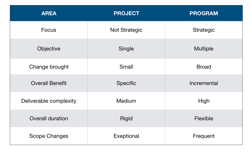 Here you can see a generalist table of the main differences between Project and Program that you can find basically everywhere